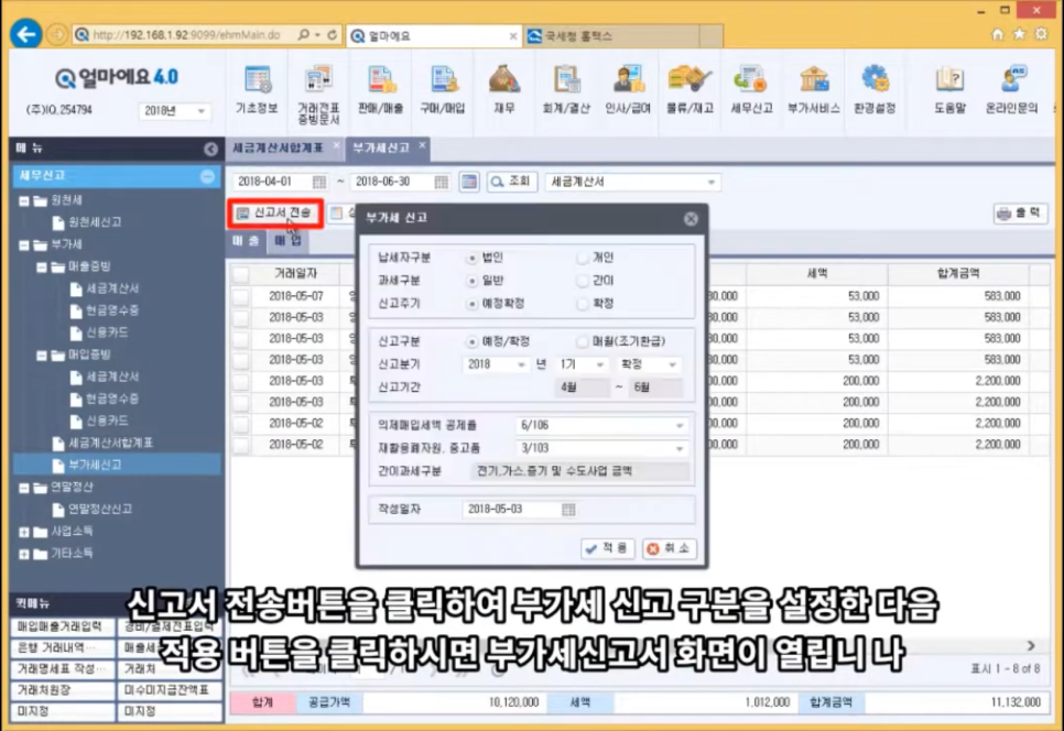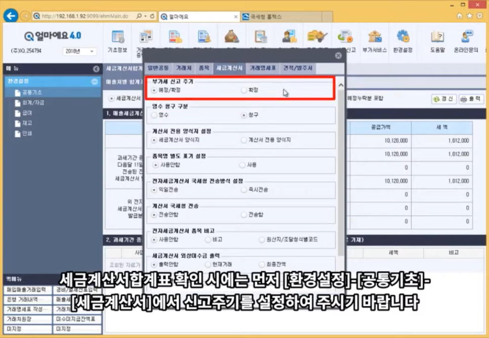 얼마에요 4.0 > 환경설정 > 공동기초 > 세금계산서에서 신고주기 설정 후, 세금계산서 합계표 확인