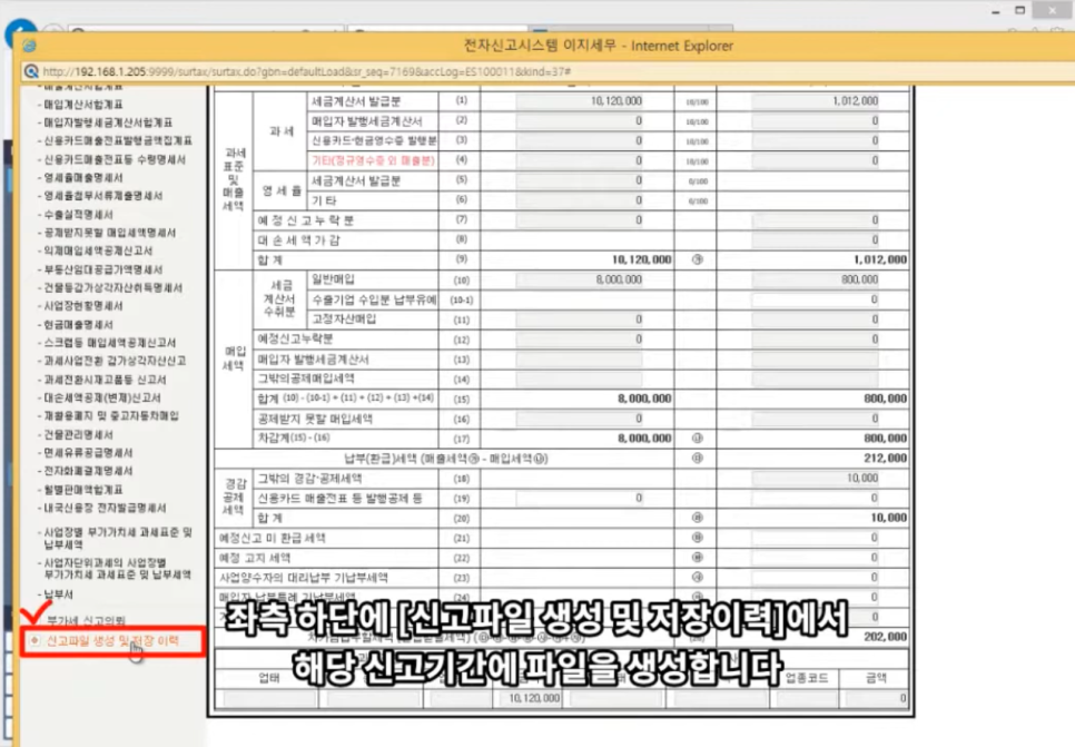 좌측 하단 '신고파일 생성 및 저장이력'에서 해당 신고기간 파일 생성