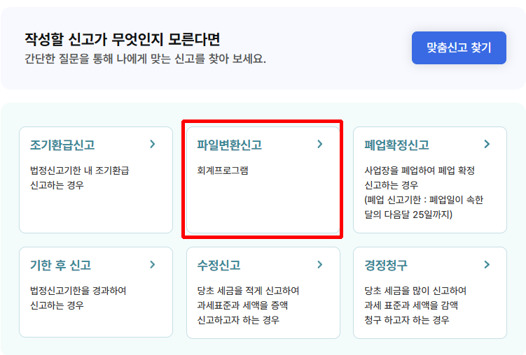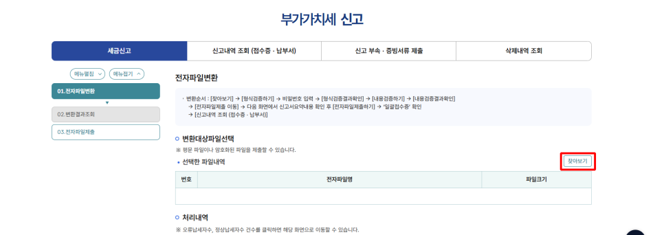 - 홈택스에 로그인 후 [신고/납부] > [부가가치세] > [파일변환신고] > [찾아보기] 버튼을 클릭하여 신고파일을 선택합니다.