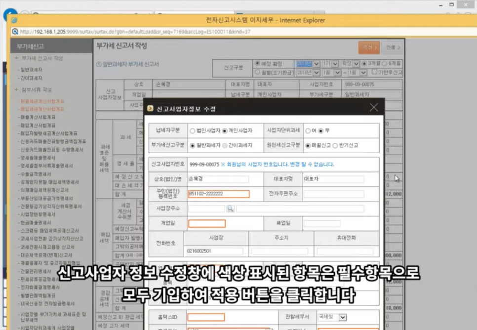 부가세신고서 화면 > 신고사업자 정보 수정창에 '색상 표시된 항목'은 모두 기입 후 적용 버튼 클릭