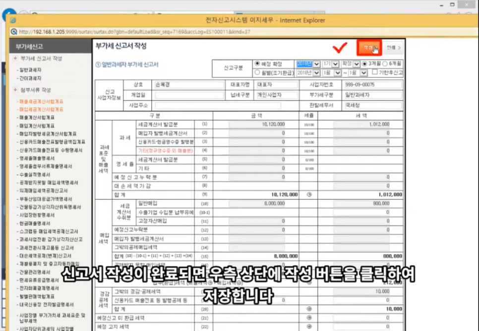 - 기간 설정 후, 부가세 신고 구분을 설정하고 신고서 작성 화면으로 이동합니다.