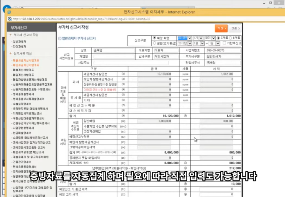 부가세신고서 작성 화면 : 증빙자료는 자동집계되나, 필요에 따라 직접 입력도 가능