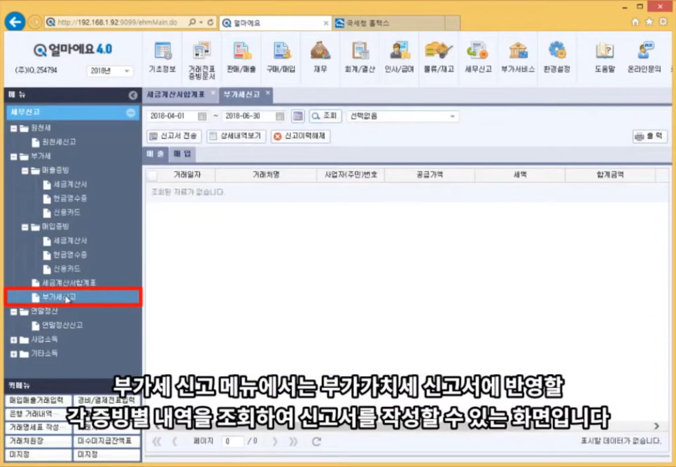 - 부가세 신고 메뉴에서 각 증빙별 내역을 조회해 신고서를 작성합니다.