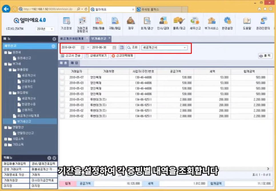 부가세신고 탭에서 기간을 설정하여 각 증빙별 내역 조회