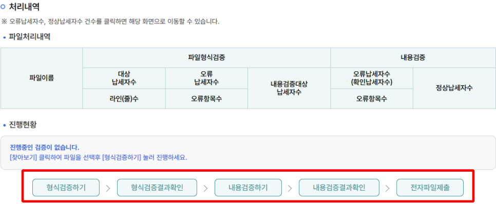- 파일 처리 내역에서 나타난 파일을 선택하여 검증 결과 확인 버튼을 클릭하여 파일 형식에 오류가 없는지 확인합니다. 이후 내용검증하기 클릭, 검증결과 확인 후 전자파일 제출 이동으로 제출하면됩니다.