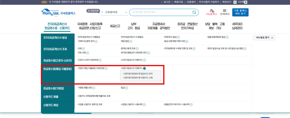- 상단 [전자(세금)계산서 현금영수증·신용카드] 메뉴 -> [현금영수증(매입·지출증빙)] -> [사업자 발급수단 전용카드] -> [사업자용 현금영수증 전용카드 신청] 클릭하기