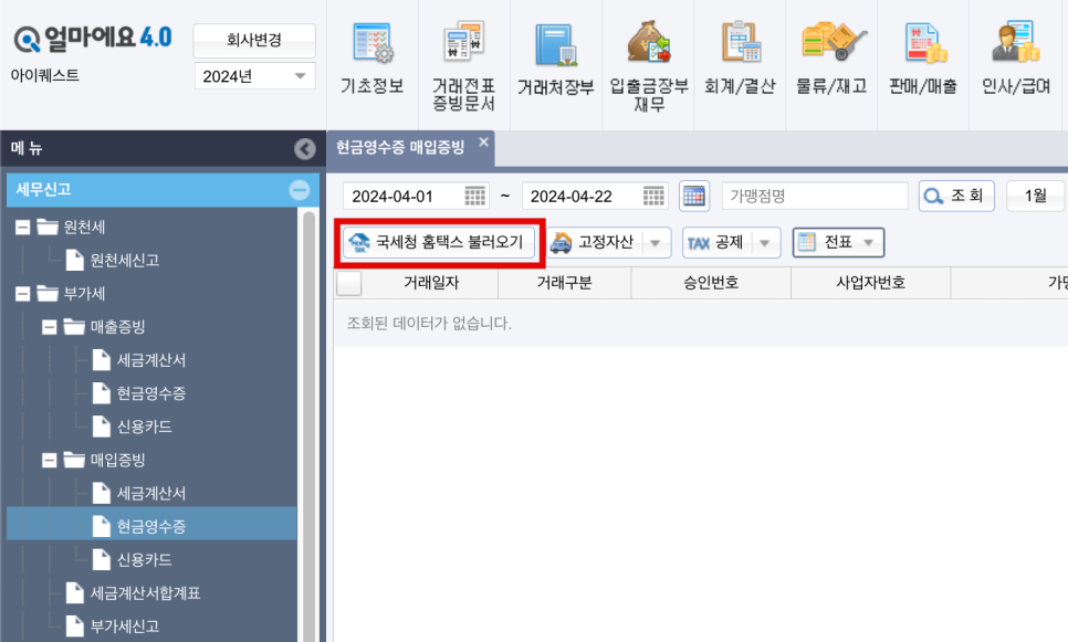 [얼마에요ERP] 고객님들은 ‘현금영수증 매입증빙’ 화면에서 국세청 홈택스에 등록된 현금영수증 내역을 조회하여 여태까지 발급 받은 현금영수증을 통합 관리할 수 있어요.