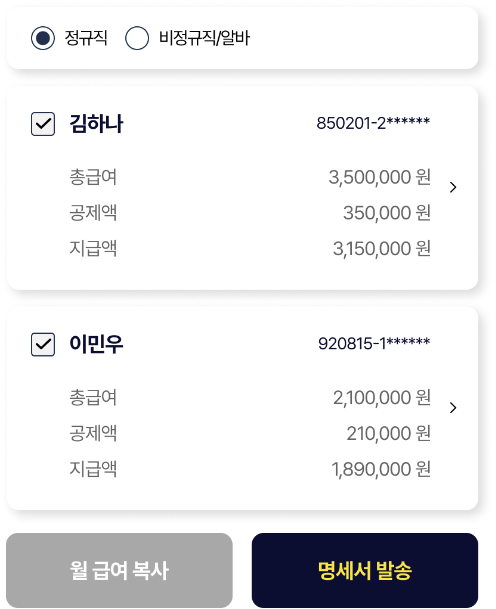 또한 근로 계약서 작성과 급여 이체, 급여명세서 발송까지 앱 하나로 해결이 가능합니다.