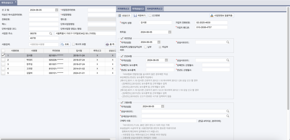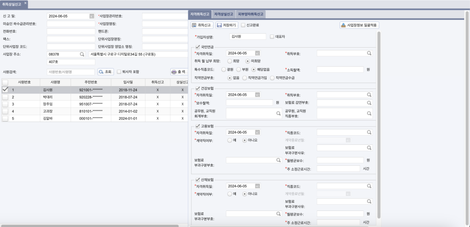사업장의 정보와 가입자(근로자)의 정보를 순서대로 입력하고 저장하면 신고가 완료됩니다. 이후 직원을 새로 고용하면 동일한 방법으로 4대 보험 자격 취득 신고를 하면 됩니다.