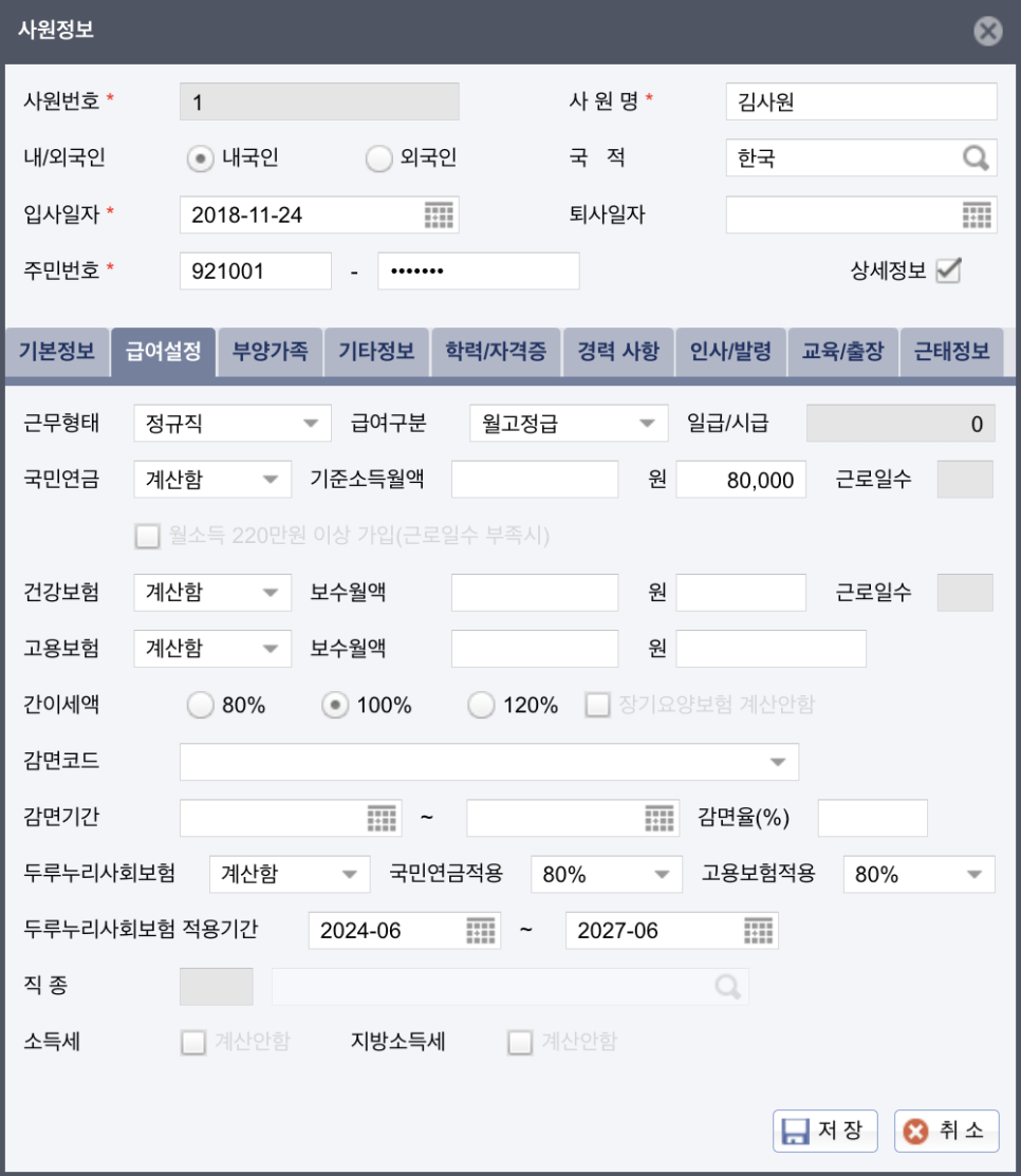 직원 정보를 등록할 때 4대 보험 적용 여부를 설정할 수 있는데요, 이는 급여 지급 시 자동으로 반영되어 4대 보험을 빠르게 계산할 수 있어요.