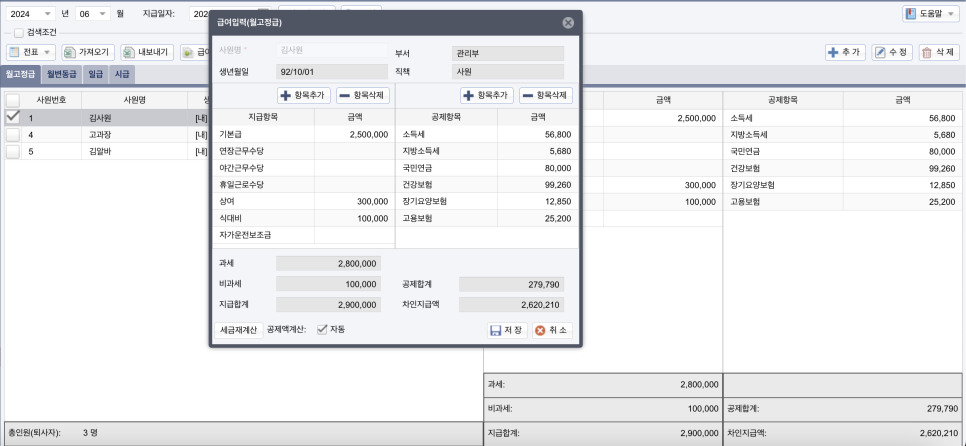 직원 정보를 등록할 때 4대 보험 적용 여부를 설정할 수 있는데요, 이는 급여 지급 시 자동으로 반영되어 4대 보험을 빠르게 계산할 수 있어요.