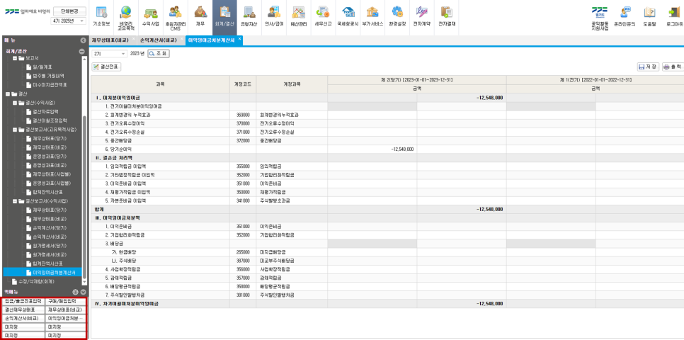 [회계/결산] 메뉴 > [결산] 항목 > 결산보고서(수익사업) 항목 선택 > [이익잉여금처분계산서] 확인