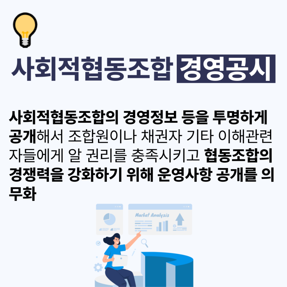 협동조합 기본법에서는 사회적협동조합의 경영정보 등을 투명하게 공개해서 조합원이나 채권자 기타 이해관련자들에게 알 권리를 충족시키고 협동조합의 경쟁력을 강화하기 위해 운영사항 공개를 의무화하고 있는데, 이것이 바로 경영공시입니다.