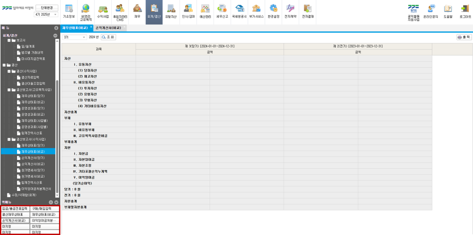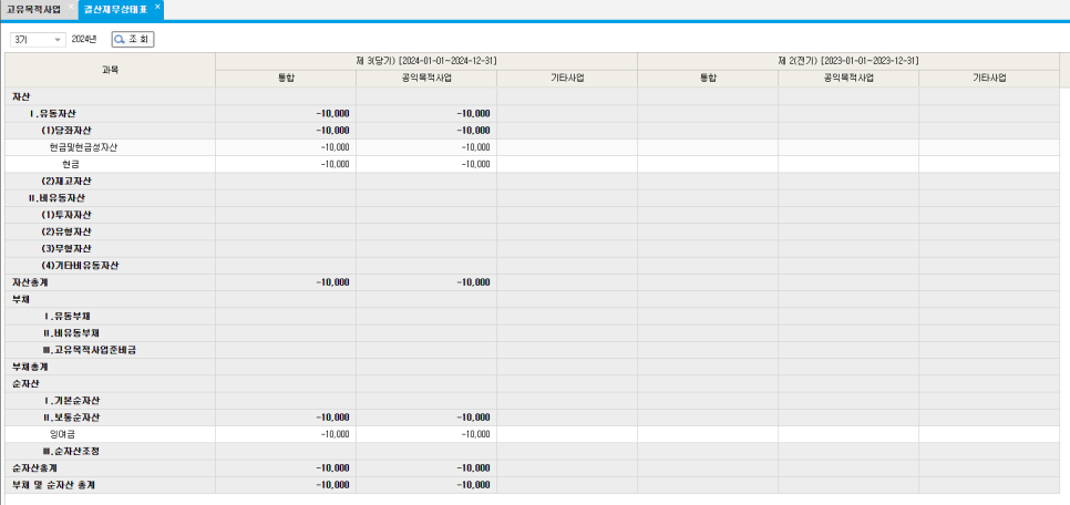 [회계/결산] 메뉴 > [결산] 항목 > 결산보고서(고유목적사업) or 결산보고서(수익사업) 항목 선택 > [재무상태표] 확인