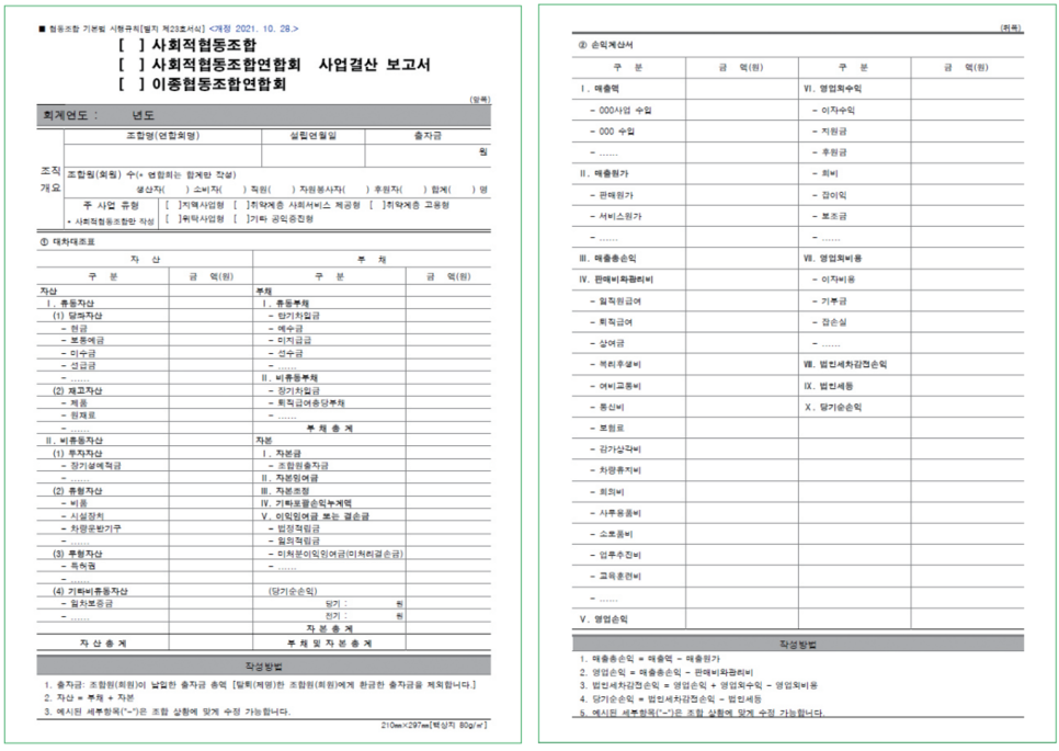 해당 서류를 토대로 첨부파일 1- 사업결산 보고서를 작성할 수 있게 됩니다. (*대차대조표 작성란 : 좌측 이미지 / 손익계산서 작성란 : 우측)