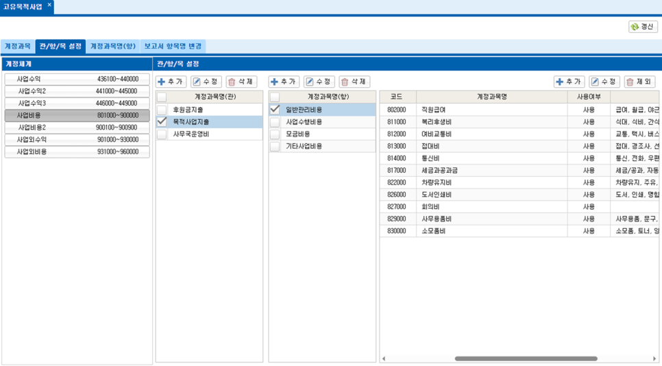 얼마에요 비영리에서는 비영리 법인에서 필요한 계정 체계, '관/항/목'을 그대로 사용할 수 있습니다.