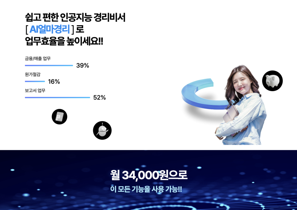 이 모든 기능과 서비스를 한달에 34,000원으로 해결할 수 있으니, 지금 바로 경리회계와 세무 업무에 들어가는 비용과 시간을 획기적으로 줄여보세요.