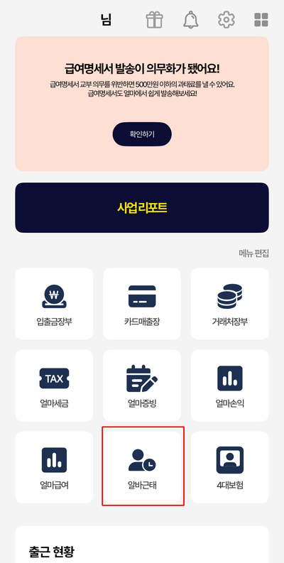STEP 01. ‘얼마’ 앱 > ‘알바 근태’ 접속