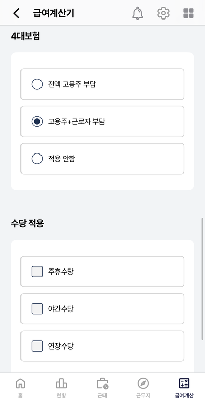 STEP 04. 4대보험/수당적용 여부 선택