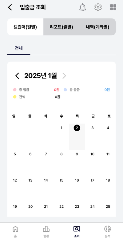 - 입출금관리 : 계좌별 입출금 내역과 상세 내역을 한 눈에 보기 쉽도록 자산리포트/캘린더 형태로 제공하며, 대금 이체도 앱 안에서 가능합니다.