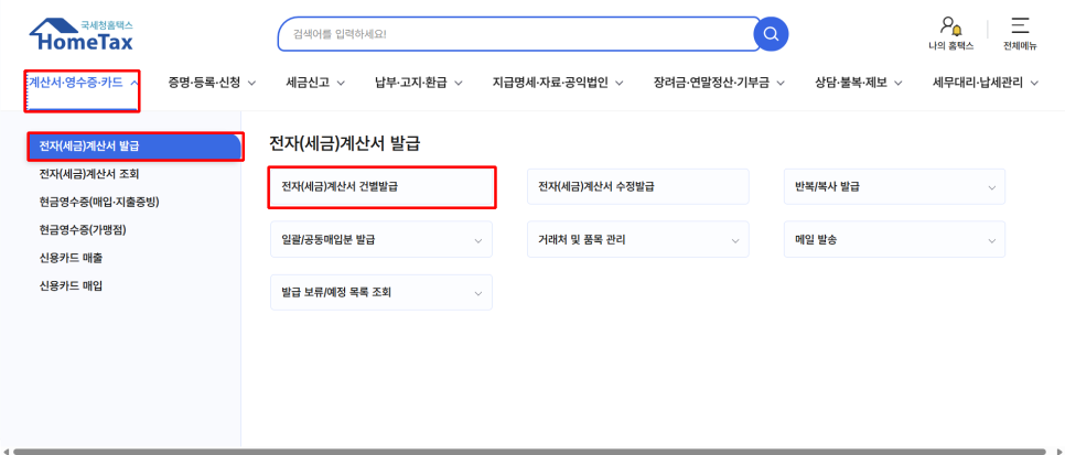 3. ‘계산서,영수증,카드 > 전자세금계산서 발급 > 전자세금계산서 건별발급’ 메뉴를 선택합니다.