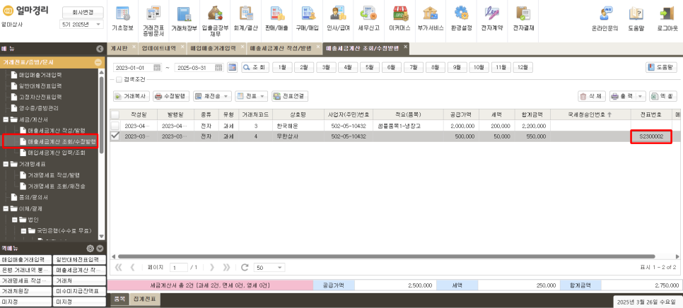 발행 여부는 ‘매출세금계산 조회/수정발행’ 탭에서 즉시 확인하실 수 있습니다.