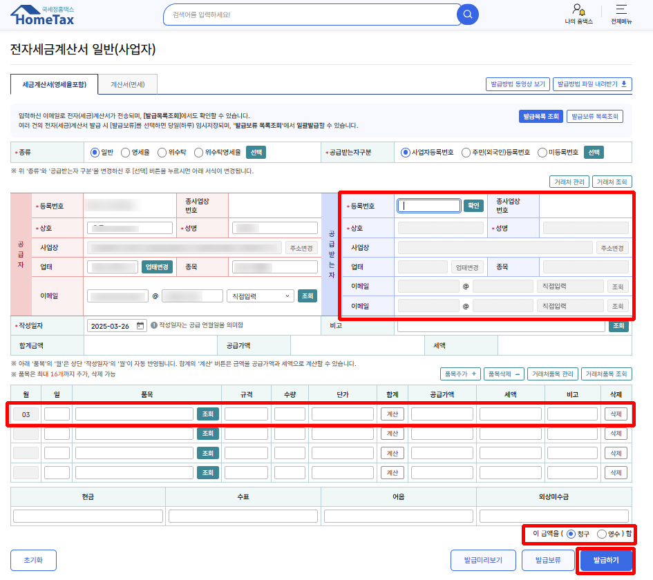 4. 공급받는 자의 사업자등록번호와 상호, 성명, 이메일 등 정보를 입력하고, 작성일자, 품목, 단가, 금액을 기재합니다.