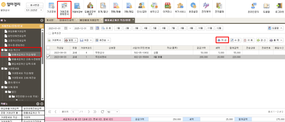 - 거래전표 증빙 문서 > 세금/계산서 > 매출세금계산 작성/발행 클릭한 후 발행 원하는 거래 내역을 클릭한 후 ‘작성’ 버튼을 누릅니다.