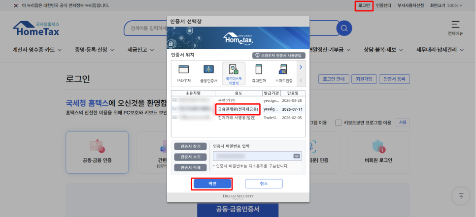 2. ‘전자세금계산서 공인인증서’로 로그인을 합니다. (만약 인증서 등록이 되어 있지 않다면 ‘인증센터’ 메뉴에서 사전 등록 후 로그인해 주세요.)