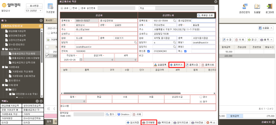2. 거래처 정보는 자동으로 입력되며, 품목과 금액, 영수/청구 여부만 선택한 후 ‘전자발행’을 누르면 끝입니다.