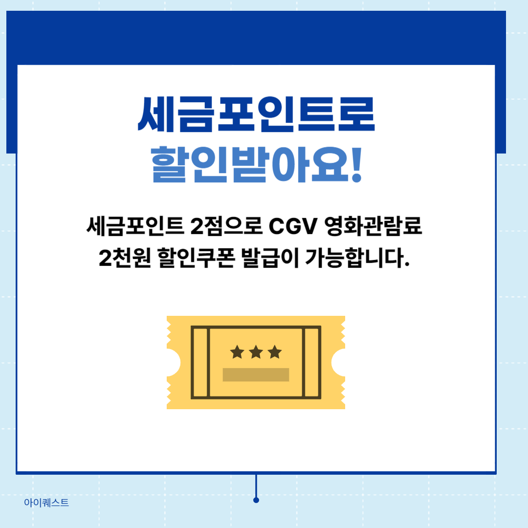 개인 및 법인 납세자는 세금포인트 2점으로 CGV 영화 예매 할인쿠폰을 발급받을 수 있습니다.