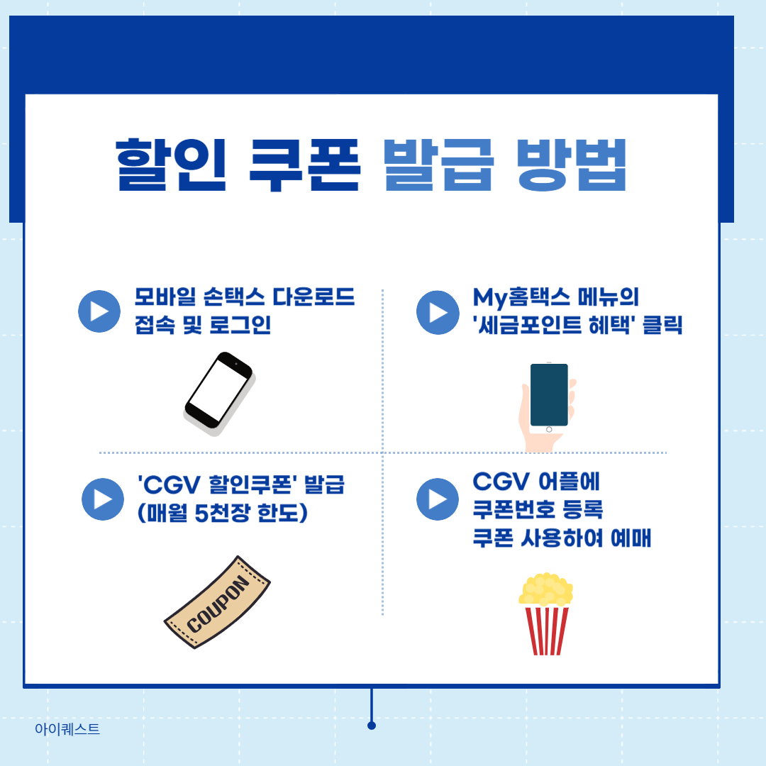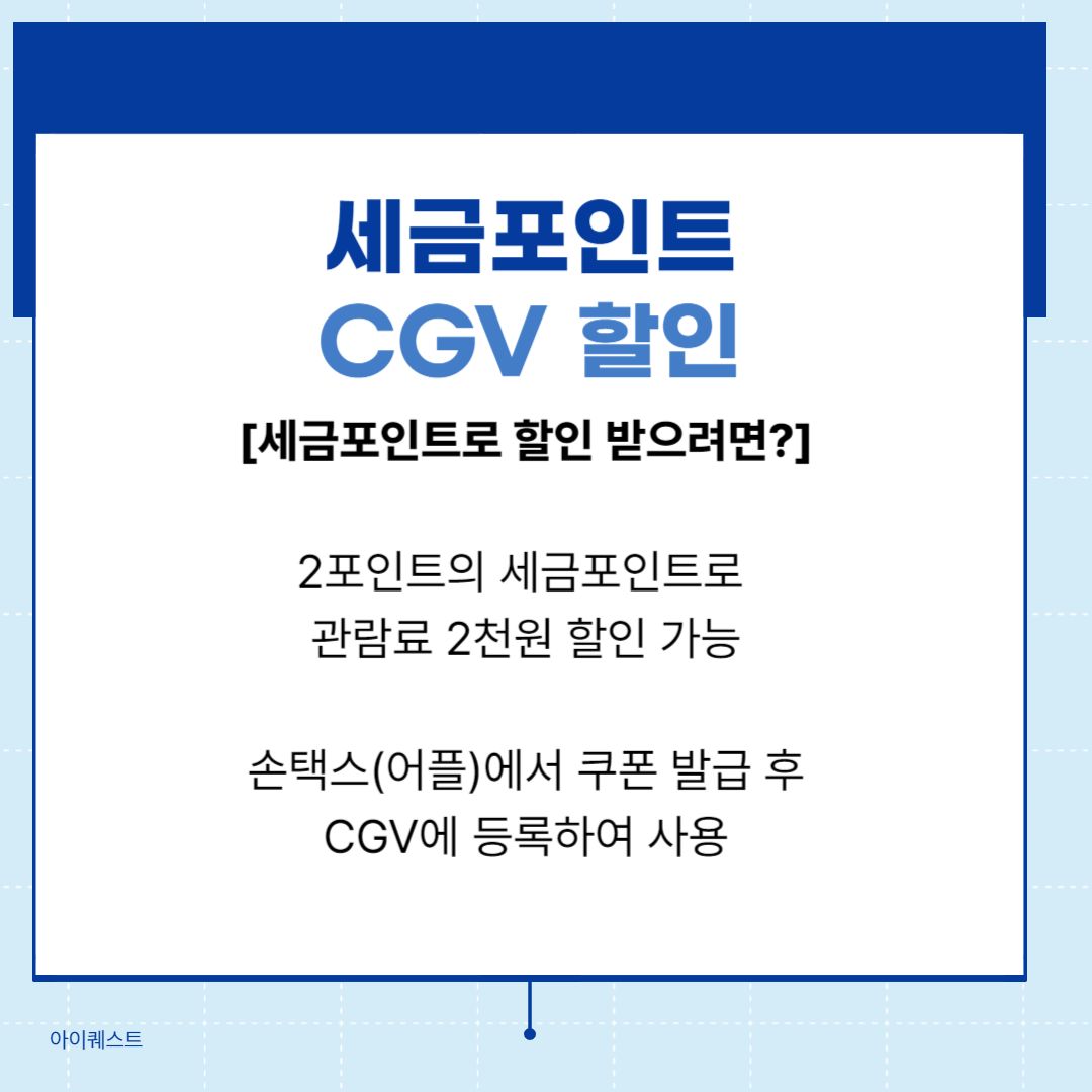 세금포인트로 CGV 할인 혜택을 받으시려면 모바일 손택스(홈택스 어플)을 다운로드하고, 세금포인트 혜택을 이용해 영화 할인쿠폰을 발급받으셔야 합니다. 쿠폰은 매월 5,000장 한도로 발급이 가능하며, 발급받은 쿠폰은 CGV 어플에 등록하여 온라인 예매 시 사용하시면 됩니다.