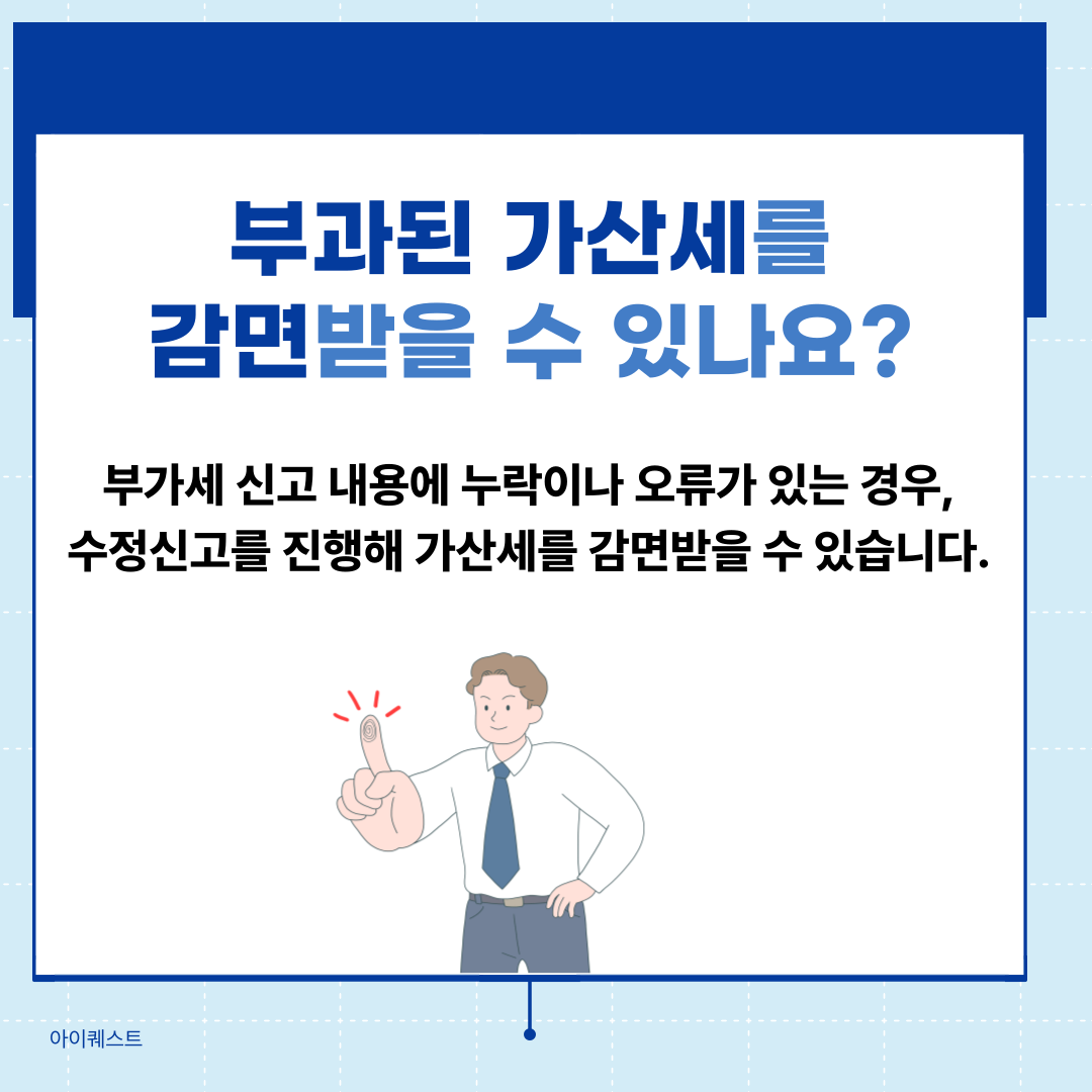 만약 부가세를 기한 내 신고·납부하지 못하였거나 신고 내용에 누락이나 오류가 있어 가산세가 부과되었다면, 가산세를 감면받을 수 있도록 최대한 빨리 수정신고 등의 조치를 취하셔야 합니다. 다만 부가세가 부과된 사유에 따라 처리 방식 등이 달라질 수 있으며, 경정청구를 진행하셔야 하는 경우에는 세무대리인을 통해 절차를 진행하시는 것이 사업에 도움이 될 수 있습니다.