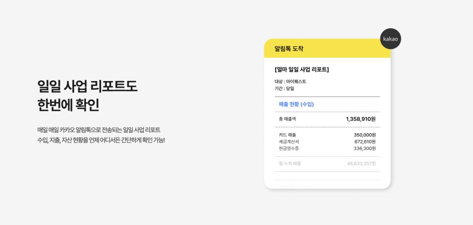 아이퀘스트의 소상공인 전용 경영 플랫폼 [얼마]는 소상공인들이 안정적으로 사업체를 운영할 수 있도록 손익계산서와 같은 재정 관리 및 간편장부 기능, 세무, 임직원 근태 관리 등 경영에 필수적인 기능들을 제공해요.