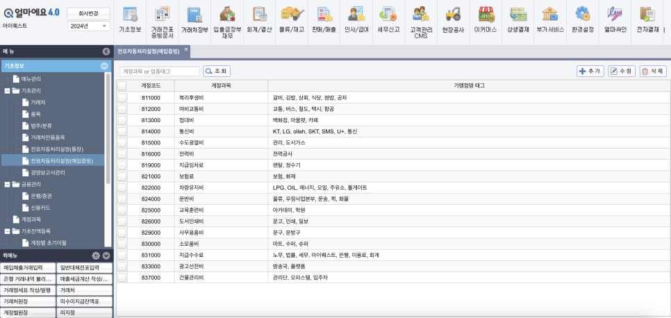 [얼마에요 ERP] 시스템에 계정과목과 관련된 지출 태그를 설정하면, 등록된 사업자 카드와 통장에서 거래가 발생할 때마다 자동으로 거래 내역을 계정 과목에 맞게 기록합니다.