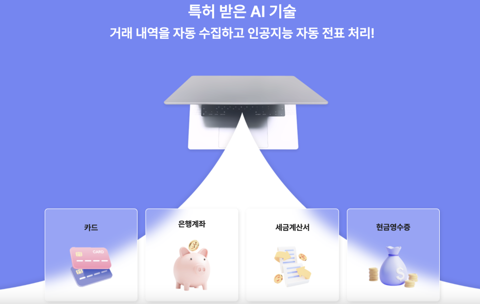 [얼마에요 ERP]만의 AI 특허 기술을 이용해서 모든 거래 내역을 자동으로 수집 및 전표 처리하여 [얼마에요 ERP] 시스템에 등록할 수 있습니다.