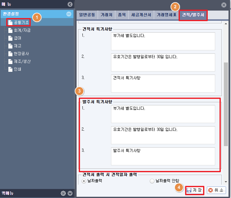 [환경설정]-[공통기초]-[견적/발주서]메뉴에서 발주서와 견적서의 특기사항을 각각 등록할 수 있습니다.