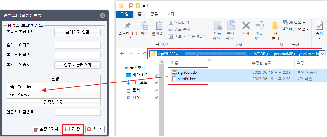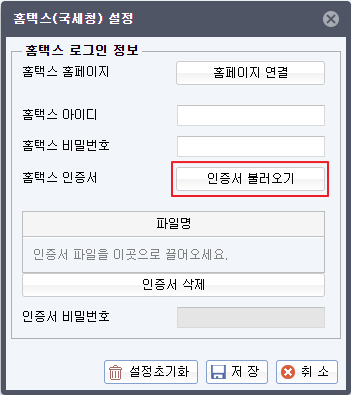 해당 폴더 내 파일을 모두 선택하여 [홈택스(국세청)설정] 창의 파일명 위치에 드래그 하여 가져오기 하신 후 저장하시면 됩니다.