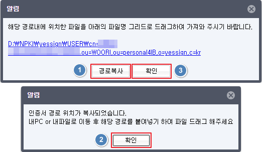 아래 메시지가 나오면 [경로복사]를 누르신 후 [확인]을 누릅니다.