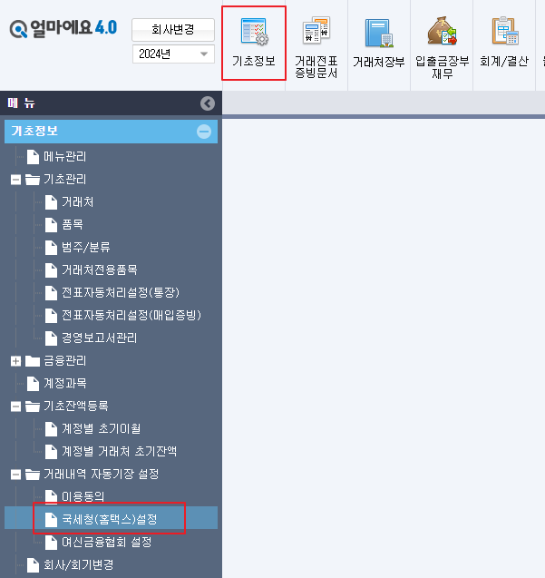1. [기초정보] - [거래내역 자동기장 설정] - [국세청(홈택스)설정] 을 클릭