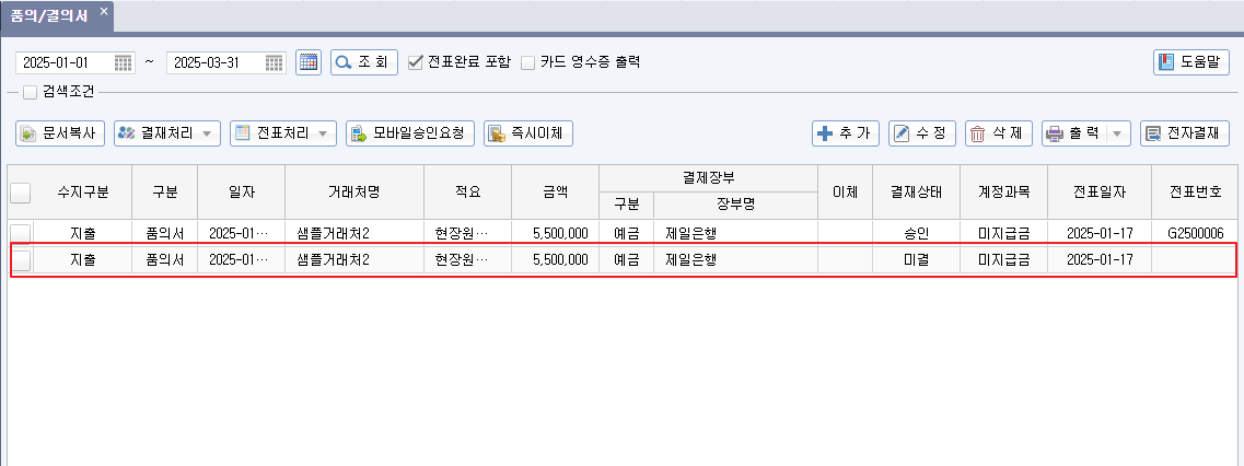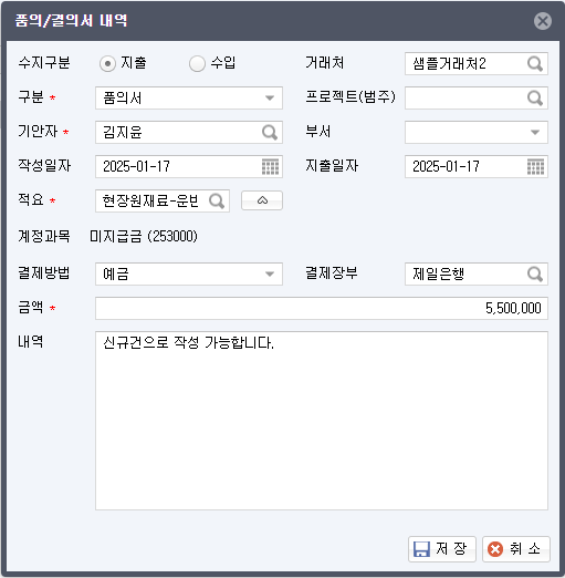 신규건으로 작성하는 품의/결의서는 전표 번호가 연결되지 않은 신규 내역으로 추가됩니다.
