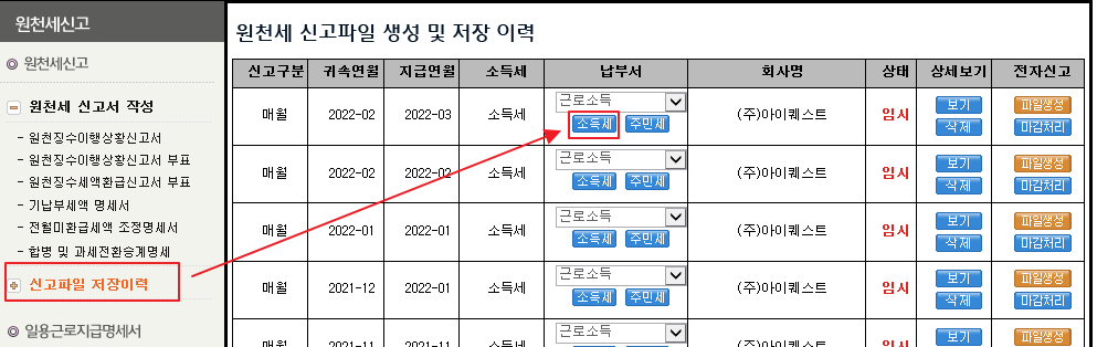 원천징수이행상황신고서를 저장하신 후