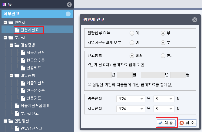 [세무신고]-[원천세신고] 메뉴에서 귀속연월, 지급연월을 선택하여 [적용] 시 해당 기간의 원천세 신고서가 작성이 됩니다.