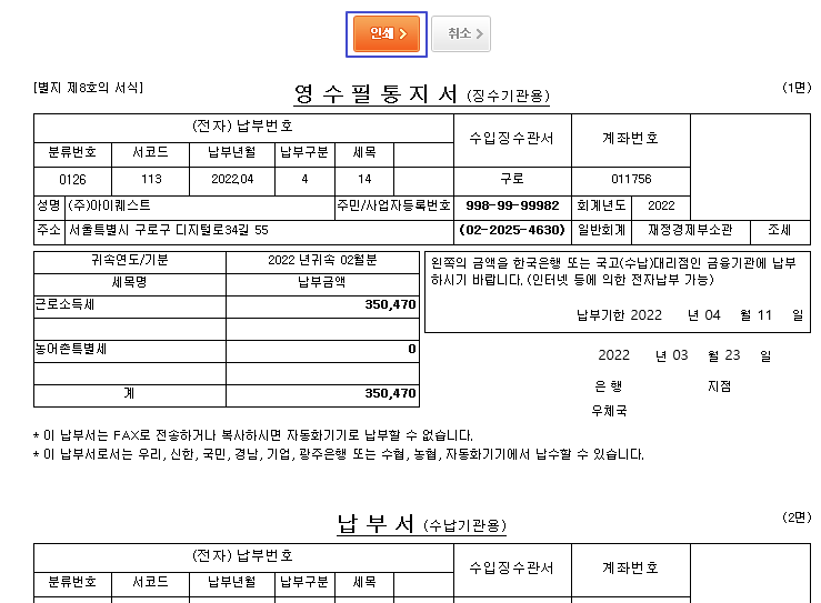 원천징수이행상황신고서에 저장된 금액으로 소득세 납부서 금액이 자동 등록되며 수정할 수 없습니다. 확인 후 [인쇄]하면 됩니다.
