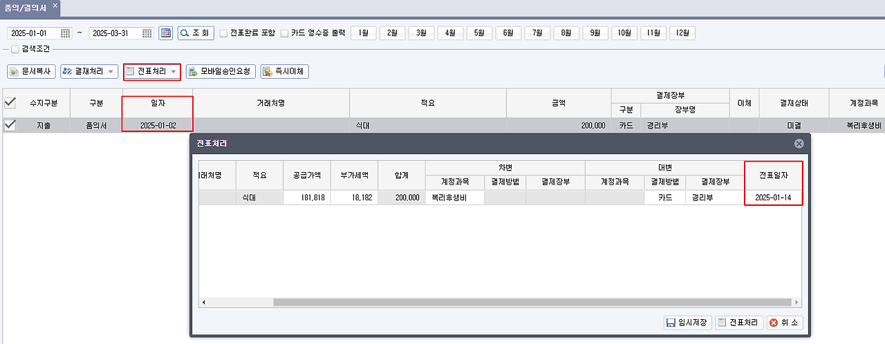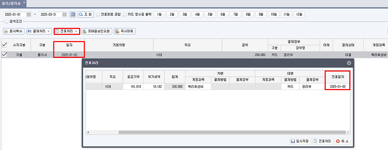 현재 기본 설정(전표일자)은 [거래전표 증빙문서]-[품의/결의서] 추가로 품의/결의서를 입력 후 전표처리 시