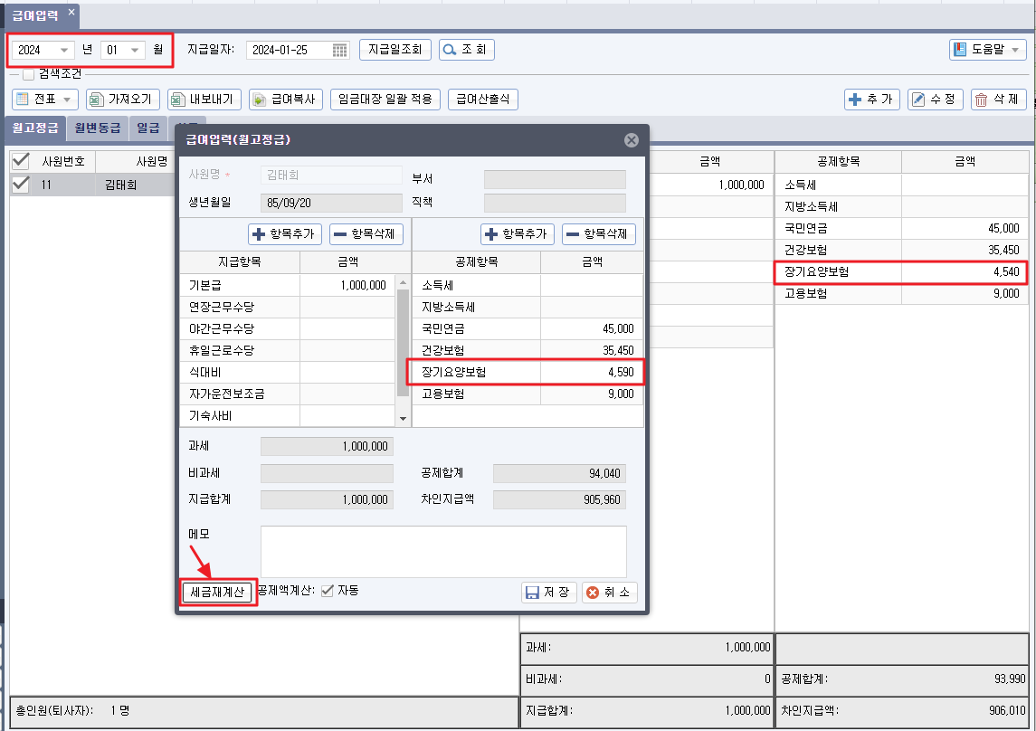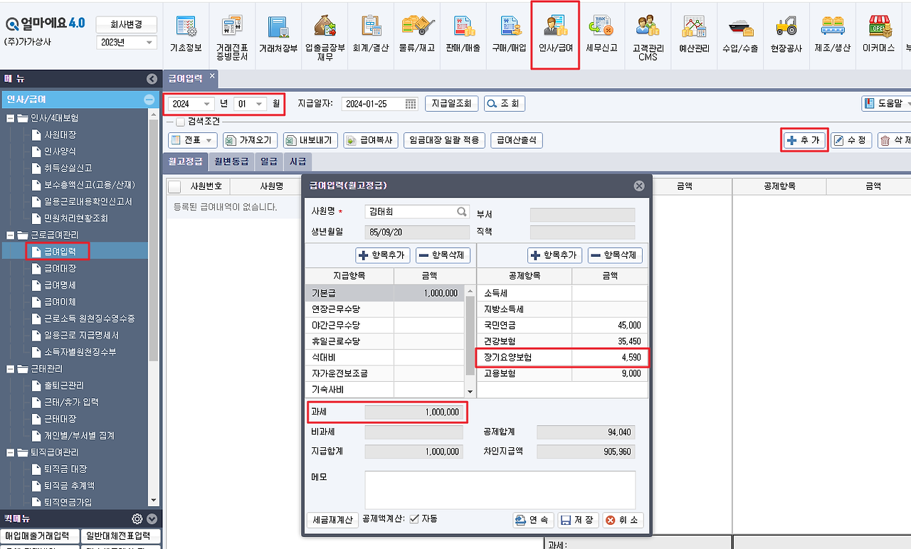 [인사/급여]-[급여입력]에서 귀속년월을 2024년 01월로 지정하여 [추가]버튼으로 급여 입력 시 인상된 장기요양보험료로 자동계산 됩니다.