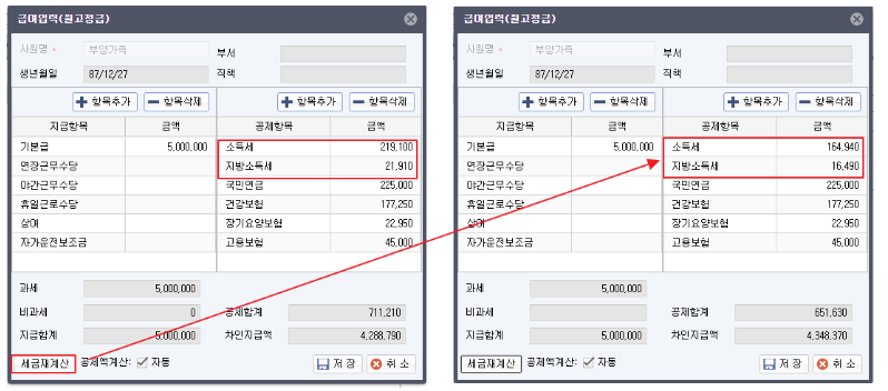 변경된 간이세액을 반영하시려면 [급여입력] - 직원선택 후 [수정] -[세금재계산] 버튼을 눌러주시면 조정분이 반영됩니다.