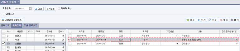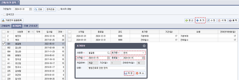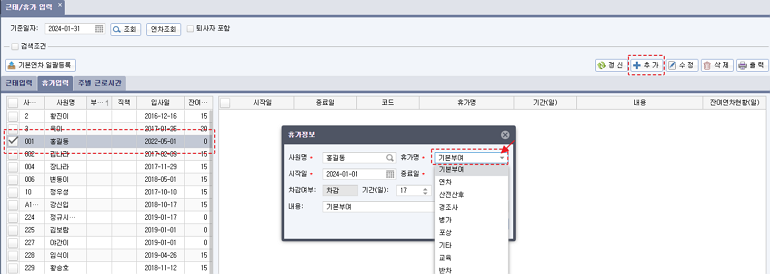 사원을 선택하여 [추가]버튼으로 휴가정보 입력창을 열어 휴가명에서 항목을 선택하여