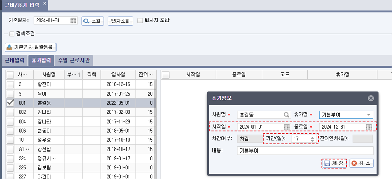 시작일~ 종료일 지정한 후 기간(일) 항목에 기본연차 부여일수를 입력 후 [저장]하면 됩니다.