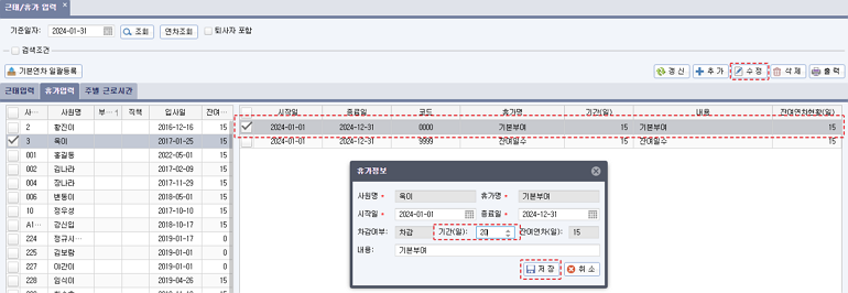 등록된 기본부여 연차일수를 수정하려면 휴가명 : 기본부여 항목을 선택하여 더블클릭 또는 [수정] 버튼으로 수정창을 열어 기간을 수정하여 [저장]하면 됩니다.
